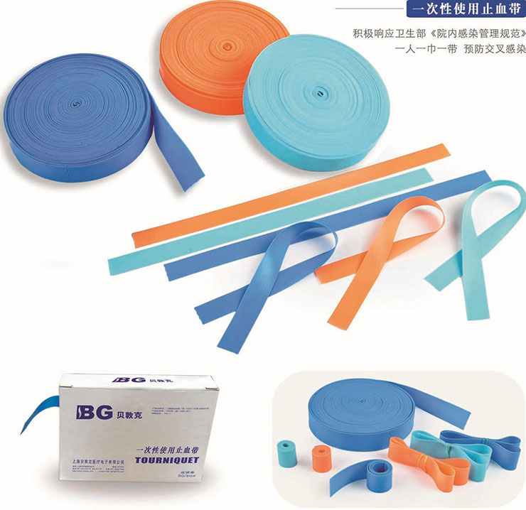 上海貝敦克醫(yī)療電子有限公司生產(chǎn)的"BG貝敦克"牌一次性使用止血帶,根據(jù)臨床需求不同,分為BGT-1型、BGT-2型、BGT-3型、BGT-4型等不同型號,供醫(yī)護(hù)人員臨床方便使用。用于醫(yī)院病人靜脈輸液和血站、醫(yī)院采血及急救止血時(shí)使用。